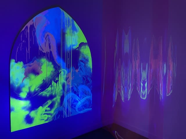 I make installations and experiences based around painting; my work uses themes such as renaissance, rave, light and sacred space. The paintings usually appear in the structure of an altarpiece panel, using materials such as UV reactive pigment, acrylic paint, spray paint and oil paint