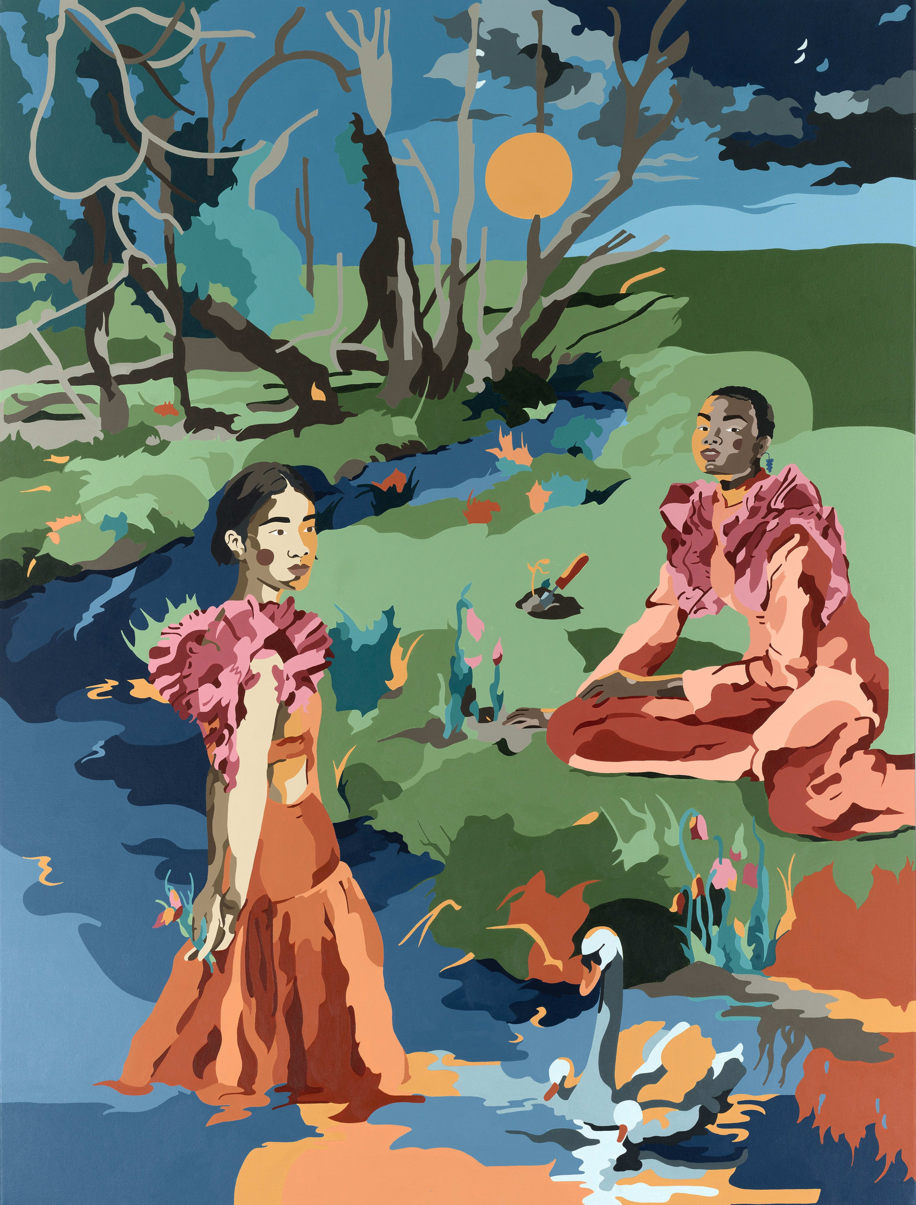 Get a Load of This! explores ideas of embodiment and dualities of the self, seen in the works of Dodi King, Shipei Wang and Ariane Hughes. King’s work Fortune Teller dazzles the viewer with the notion of multidimensionality where the work honours the innate duality of humanity regarding both the physical, animal state of being as well as our potential for spiritual transcendence. It is a multifaceted celebration of feminine sexuality, eroticism, and creationism. Similarly, Wang’s Gacela of the Remembrance breaks down the multifaceted nature of identity. She invites the viewer to enter a trance-like dream state through the depiction of two characters who share a moment of intimacy - in reality, they are the product of forgotten identities swept away by the banality of daily routine.