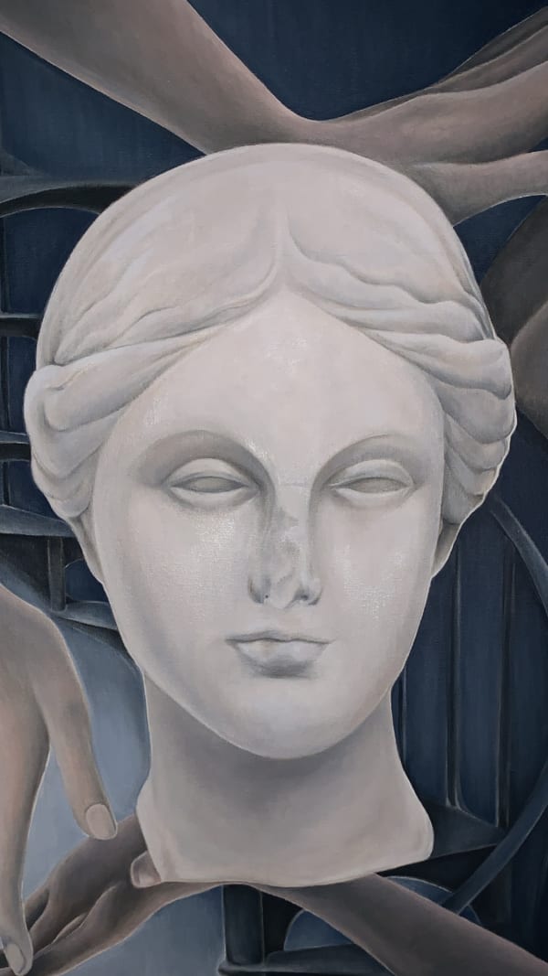 I draw inspiration from a wide range of sources. I take a lot of photos. I have over 100,000 on my phone & I’m forever making folders of reference images (ie clouds, swans, hands, classical paintings, screenshots from films etc) so I have a wealth of imagery to hand. Prior to the pandemic I lived and made work in Milan for 8 months. I spent a lot of time in churches and cemeteries. This can be seen to manifest itself in the classical sculpture and architectural elements in my work.