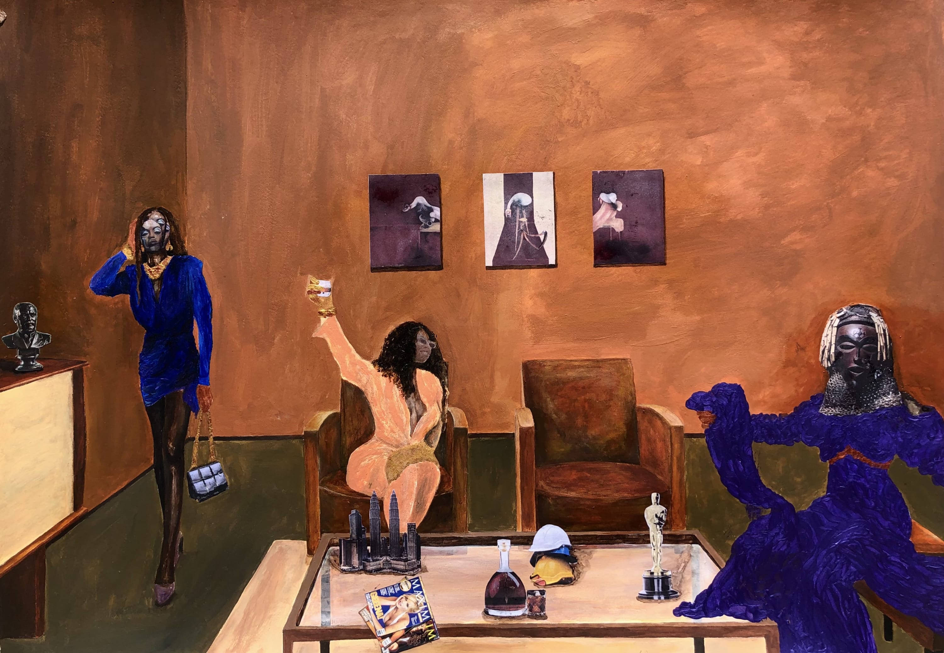 Masculine Traits III - Part of the MASCULINE TRAITS series that is about the black woman occupying typically male-dominated spaces, positions and status. Since inequality has led the black women over the years to compete with men in different industries, when they dare to elevate themselves they are labelled as arrogant, ambitious, too successful, too bold, intimidating as if that is a bad thing. This space is filled with typically masculine objects however are not just for man, such as cars, whiskey, prestigious artworks, awards, the signs of being a business and property owner, exotic magazines on the table, a distinctly masculine aesthetic of leather like browns in the furniture. The women in this space challenge these ideologies and constructs, as they are soft, affirmative, nurturing, warm, daring and ever-changing. Their ambition or goals does not box them to a certain of women.