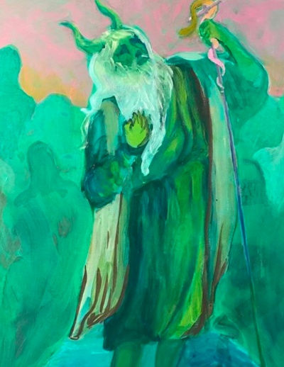 I'm inspired by the early religious artists tasked with portraying angels and demons for the first time --they had to decide on how to paint the invisible! But over time, those images became hackneyed and lost their power. I want to put myself back in the place of re-imagining the spiritual. Look at all the word images given in ancient writing: angels as wheels of eyes, pillars of fire, spiritual warfare, dragons, and thrones! How did we manage to end up with docile cherubs? I don't have exact words for what my work says, but I hope my work sounds like a klaxon and not an innocuous harp.
