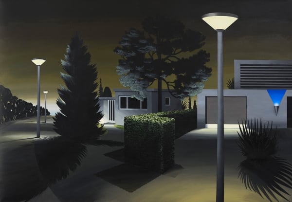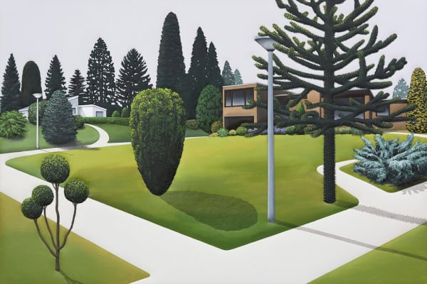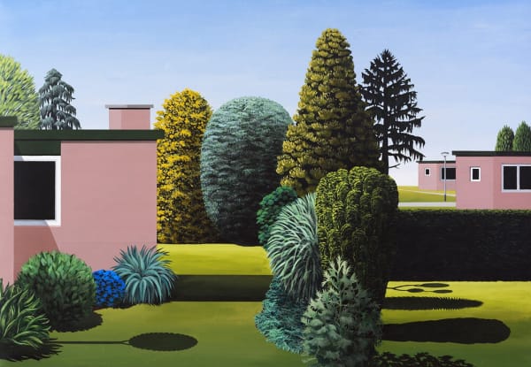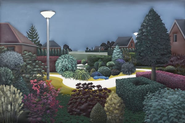 Subsequently the banal and the sacred is another more humorous line running through my work. In my recent landscapes I play a little with the commodification of gardens and frontyards. People’s longing to create their own private paradise combined with their utter lack of space and time to realise and sustain it is commodified in the shape of standardised pre-shaped plants and simplified designs which distantly echo classicist gardens and ancient depictions of the garden of Eden. It results in modern day gardens that are completely uniform, low in cost and maintenance and even partly made of plastic. Yet, in my paintings they do feel like paradise.