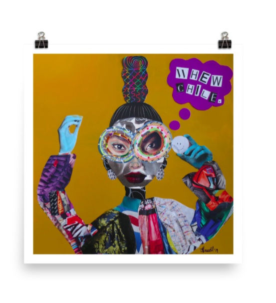 My work is very much so inspired by my life. I try always to draw a direct line from my life to my work. My experiences inform my subject manner. I make collages that are inspired by black women. The collages which I call alibiis are symbols of bold, self-confident and joyous women. They’re meant to serve as a reminder that we’re badass and WHOLE, whenever we forget.
