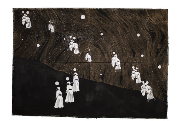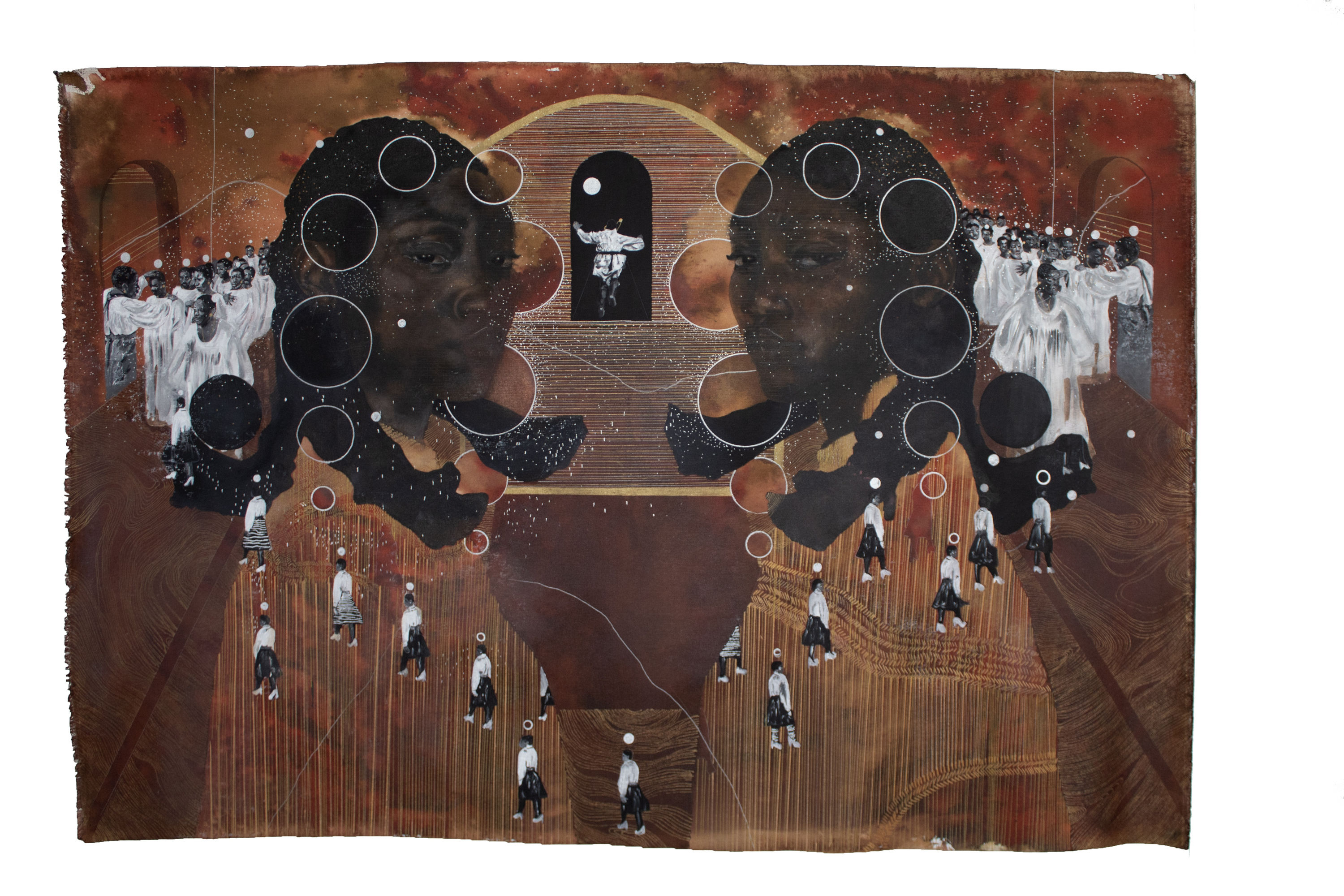 The titles of my work represent verbs, actions which manifest between worlds. They exert a movement into the work with a spirited connection with those ancestors and figures, both known and unknown. They are suggestions of a spiritual journey towards a place of healing and acceptance.