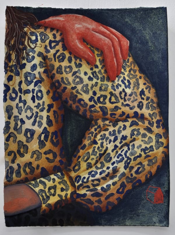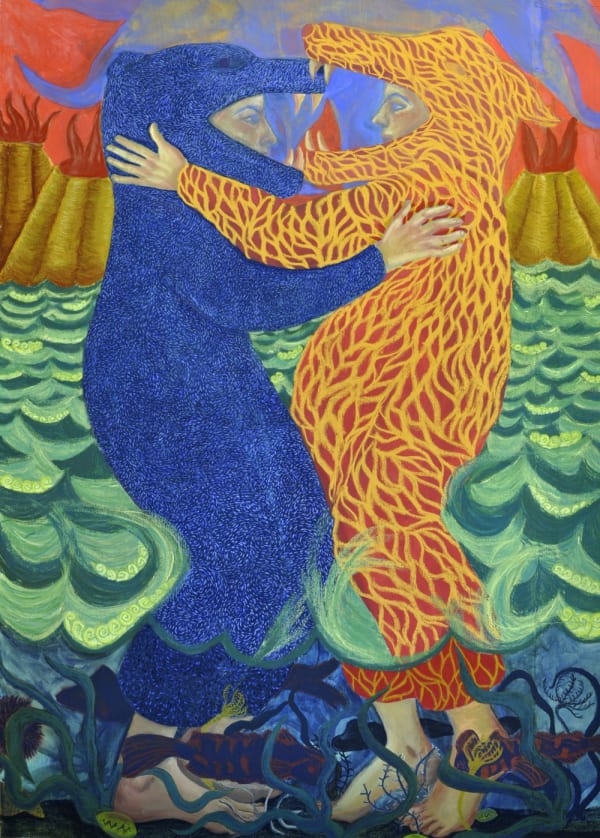 I investigate the emotional and physical spaces between people that are present in both intimate or tense moments; and the feelings of alienation this provokes. There is a sense of tenderness and touch between the figures, whilst always the possibility of struggle and strife. The animal costumes are tools to either mask, or reveal human instincts of desire, frustration and rejection.And, tell us a bit about your colour palette?