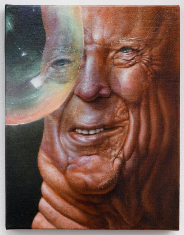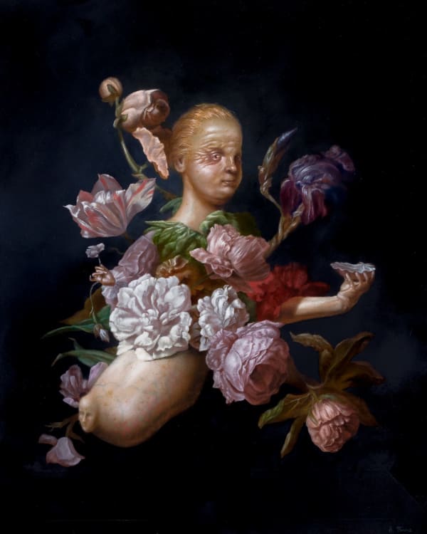 Depictions of changing and evolving people/ beings done in a stationary manner. I use old master oil painting techniques to achieve realism in order to strengthen the relatability and familiarity between the viewer and the subject. Then, by taking advantage of the familiarities that the viewer observes between the paintings and the natural world, I morph the subjects to ignite the viewer with new understandings and perceptions of this world and themselves. I like to take advantage of those little details, such as faint veins in the skin, and perfect eyeball glistens to enhance the believability… it also looks super cool :D