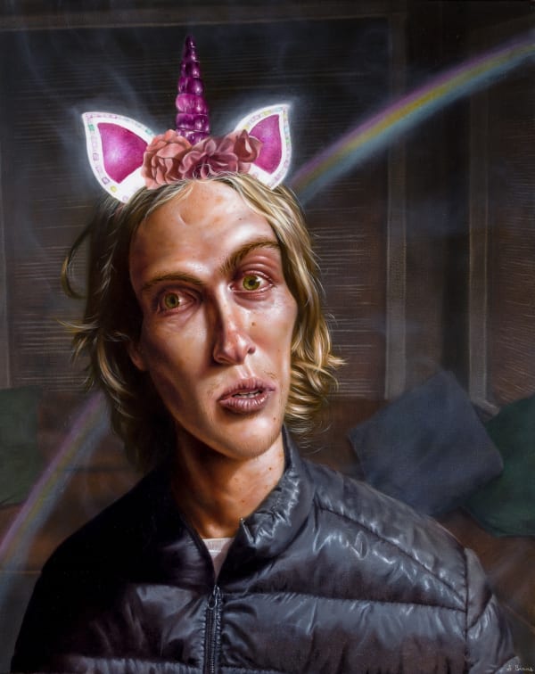 Warts and all, morphed into changing and evolving sitters in a stationary manner, though depicted in old master oil painting techniques, the relativity, familiarity and polished rawness of Sara’s work is unmatched!
