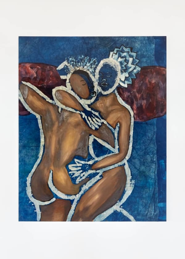 For me colour is the best way to translate emotion in art. For me yellow became very symbolic of the joy and intensity of the feelings of falling in love. The blue actually started off as just an aesthetic choice, I just really like the way dark blue and rich blue grounds complemented the black and brown skin tones of the figures in my works.