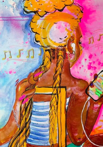 I like listening to chill music, I have a few playlists I keep in rotation. I’ve been listening to alternative and bedroom pop lately though, and always, always r&b. If I have a new album I like, I’ll play it on repeat while I’m working on a piece. Sometimes, I’ll even put on beats from youtube and freestyle while I’m painting so I can get into the flow of painting easier.