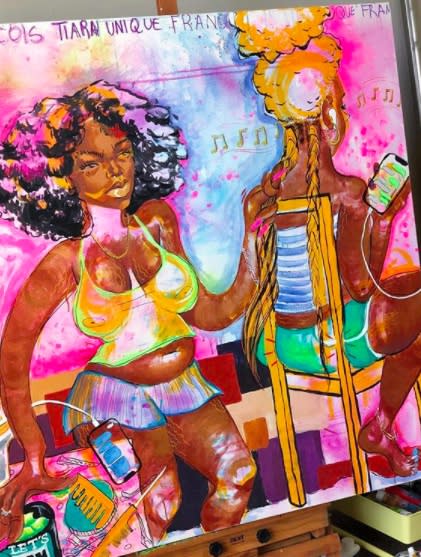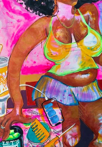 A few people that I follow on instagram and enjoy their work are @sugarygarbage, the full figured femmes and the details she includes are my favorite. @blvckbobross, some of her pieces seem to have a glow, the colors she uses are very vibrant. @ayabrown.tiff has been highlighting essential workers. @xtrajumbo's work amplifies the size of everyday beauty items specific to the black community and focuses on the femininity of it. @RxdiXnce grants us a break from heavy topics with her digital work.Is there anything else you wanted to say?